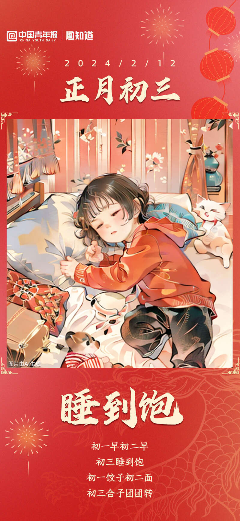 “初一早,初二早,初三睡到飽”,經過大年三十到初二期間的守歲、早起和忙碌,到了初三這天,人們可以安睡遲起,養(yǎng)足精神。今天你有什么新年安排?