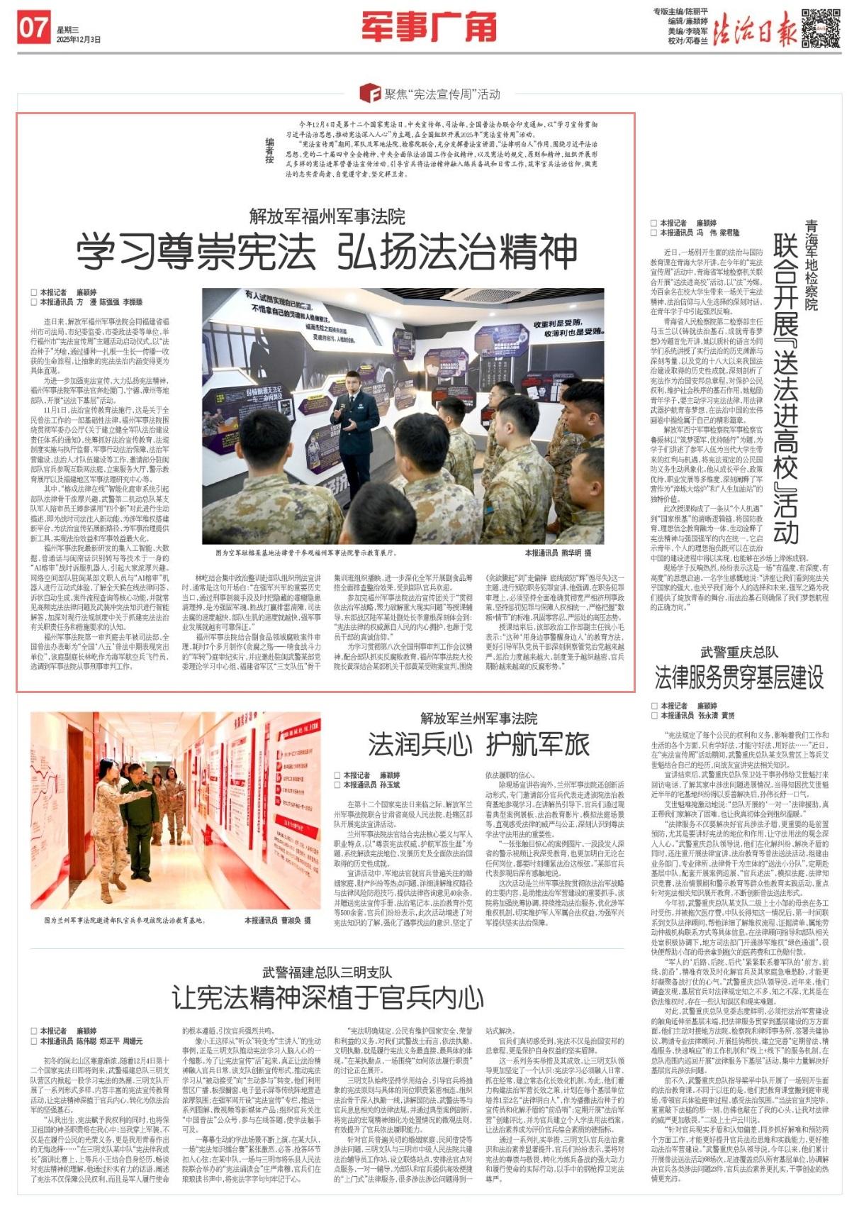 “憲法宣傳周”期間,軍隊及軍地法院、檢察院聯(lián)合,充分發(fā)揮普法宣講團、“法律明白人”作用,圍繞習近平法治思想、黨的二十屆四中全會精神、中央全面依法治國工作會議精神,以及憲法的規(guī)定、原則和精神,組織開展形式多樣的憲法進軍營普法宣傳活動,引導官兵將法治精神融入練兵備戰(zhàn)和日常工作,筑牢官兵法治信仰,做憲法的忠實崇尚者、自覺遵守者、堅定捍衛(wèi)者。